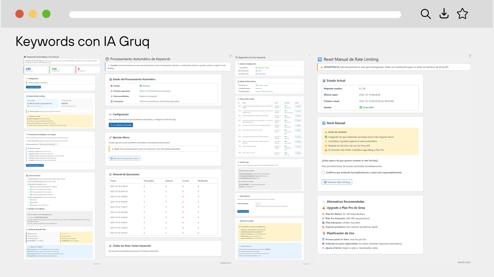 Combina análisis SEO avanzado, enriquecimiento de texto con IA, estadísticas visuales, geolocalización y automatización completa de keywords — todo desde un panel intuitivo, rápido y moderno.